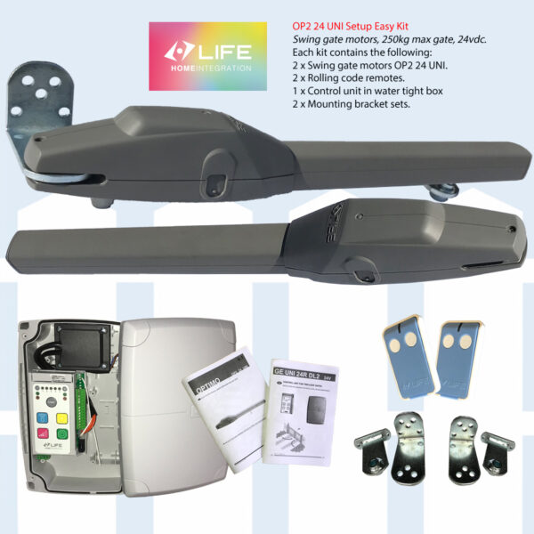 The OP2, 2m Double Swing Gate Setup is a reliable, efficient solution designed specifically for lightweight swing gates. With a maximum capacity of 200kg per gate leaf at 2.0 metres. It’s perfect for residential use, particularly with open-faced aluminium baluster-style gates.